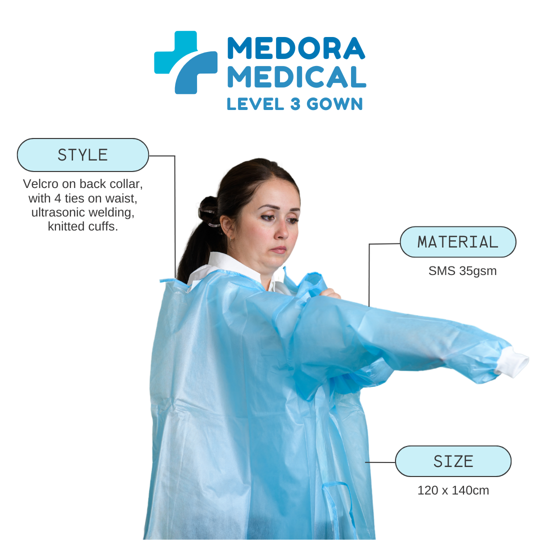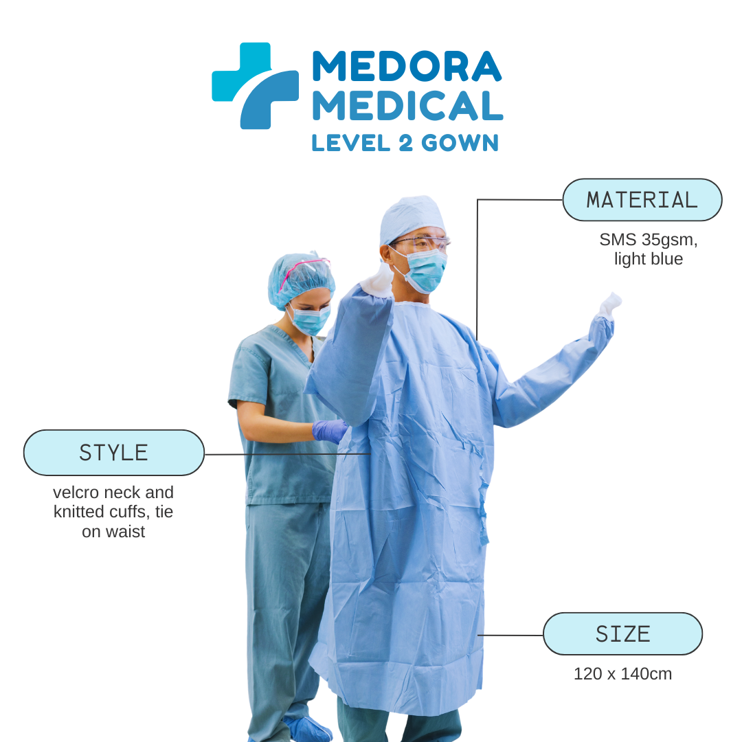 For enhanced durability and fluid resistance, our Level 2 disposable gown is crafted from 35gsm SMS fabric in a light blue color. It includes a Velcro neck closure, knitted cuffs, and a waist tie, providing a secure and adjustable fit. With a size of 120 × 140 cm, this gown is suitable for medical and procedural settings that require an increased level of protection.