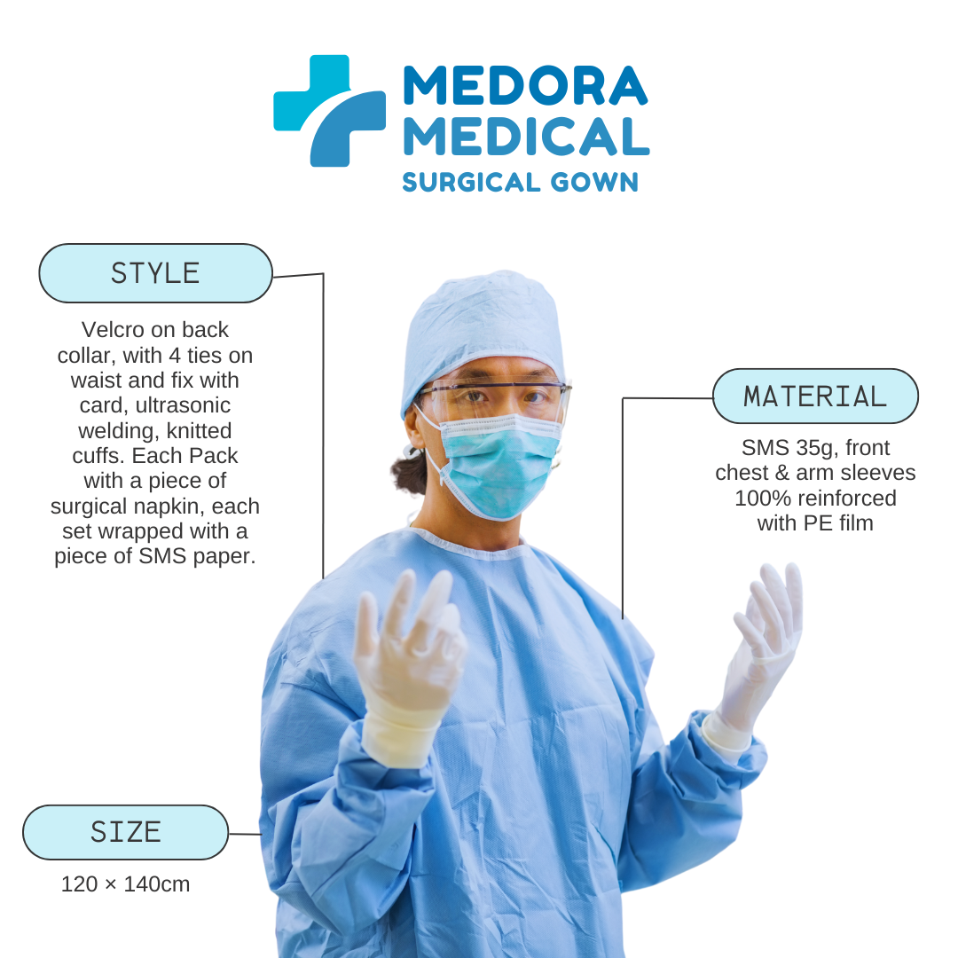 For maximum protection, our reinforced surgical gown is made from 35gsm SMS fabric with 100% reinforced PE film on the front chest and arm sleeves for added fluid resistance. Designed for surgical procedures, it features a Velcro back collar, four waist ties secured with a card, ultrasonic welding, and knitted cuffs. Each gown is packaged with a surgical napkin and wrapped in SMS paper, ensuring sterile and ready-to-use convenience. With a size of 120 × 140 cm, this gown provides the highest level of safety and reliability in operating rooms.