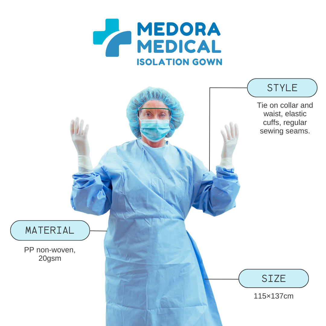 Made from 20gsm PP non-woven fabric, this lightweight isolation gown provides essential protection for medical and clinical settings. It features a tie-on collar and waist, elastic cuffs, and regular sewing seams, ensuring a secure and comfortable fit. Available in blue and measuring 115 × 137 cm, this gown is ideal for routine use where a protective barrier is needed.