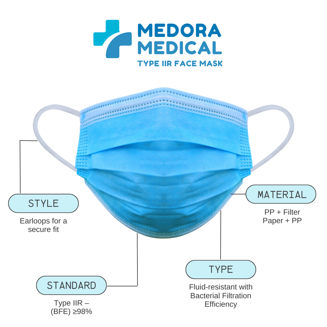Our Type IIR face masks provide the same high bacterial filtration as Type II masks but with the added benefit of fluid resistance. Designed to protect against splashes and droplets, these masks are perfect for medical professionals and high-risk environments.